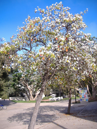 This poor tree is all confused if it's fall and should shed it's leaves or if it's spring and should sprout blossoms. That's what happens when you don't have a winter. (La Jolla, CA)