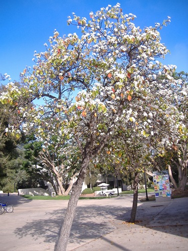 This poor tree is all confused if it's fall and should shed it's leaves or if it's spring and should sprout blossoms. That's what happens when you don't have a winter. (La Jolla, CA)